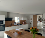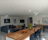 La pièce de vie de plus de 60 m² offre un bel espace cuisine ouvert avec ilôt central et séjour, 2 baies vitrées viennent illuminées cet espace qui se complète avec un cellier/buanderie et un wc.