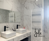 Concernant l’espace nuit, il se compose de 3 chambres et un bureau, d’une salle de bains avec double vasque, wc, douche et baignoire.